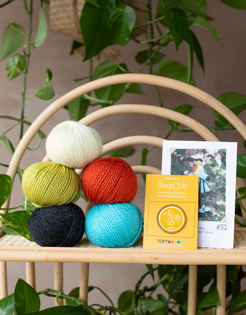 This crochet subscription includes 125g of TOFT's luxury DK pure wool, a collectable Birds Club fact card, plus access to a downloadable crochet pattern.